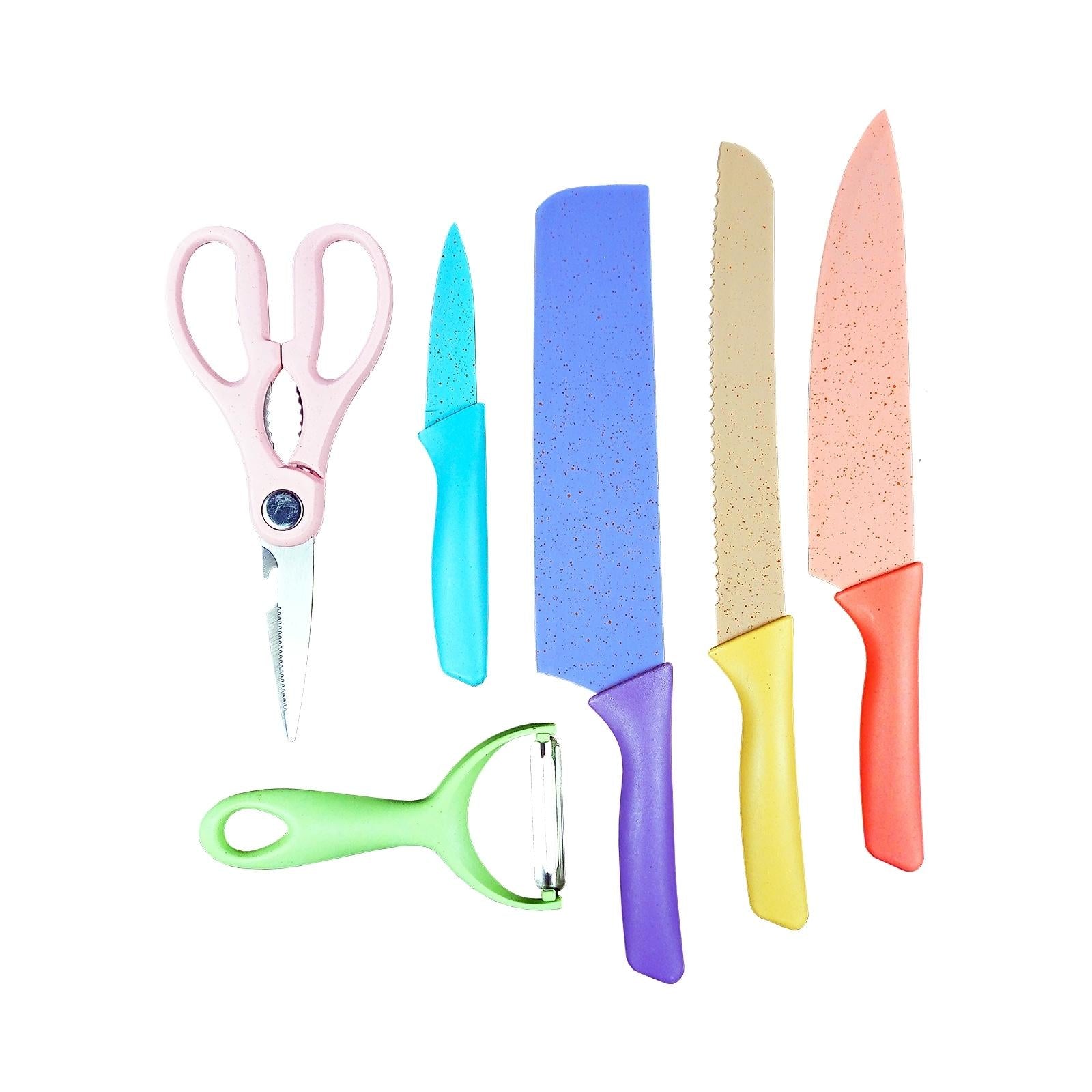 - Set incluye cuchillo de cocina, cuchillo de chef, cuchillo para frutas, pelador y tijeras.
