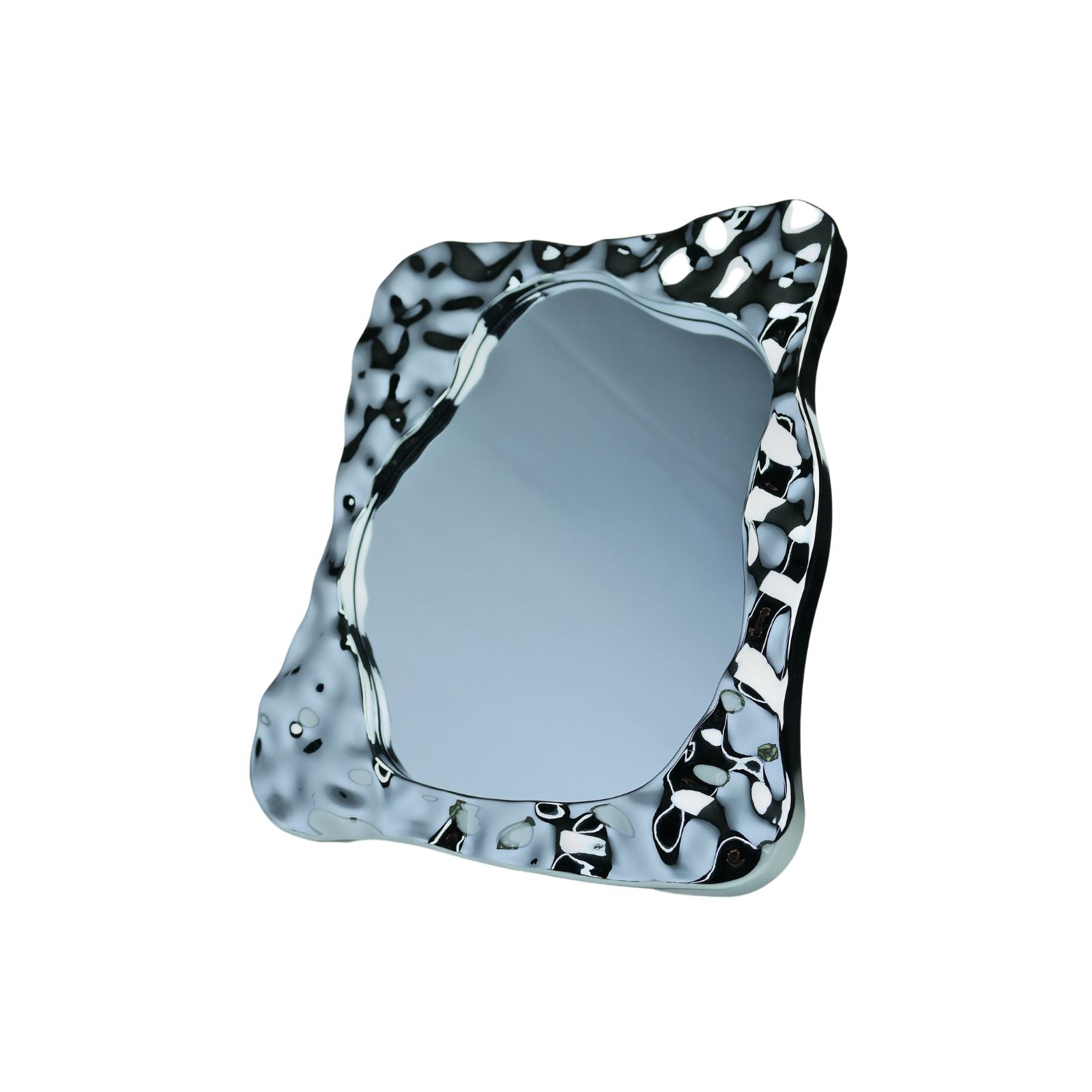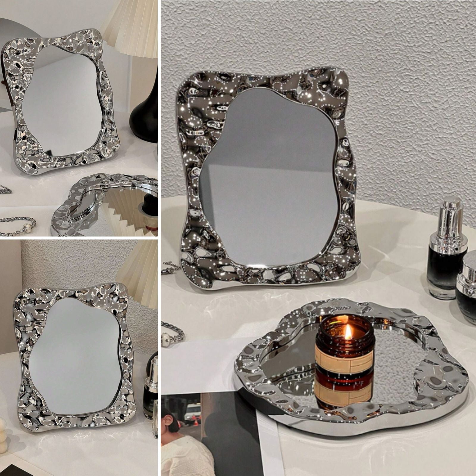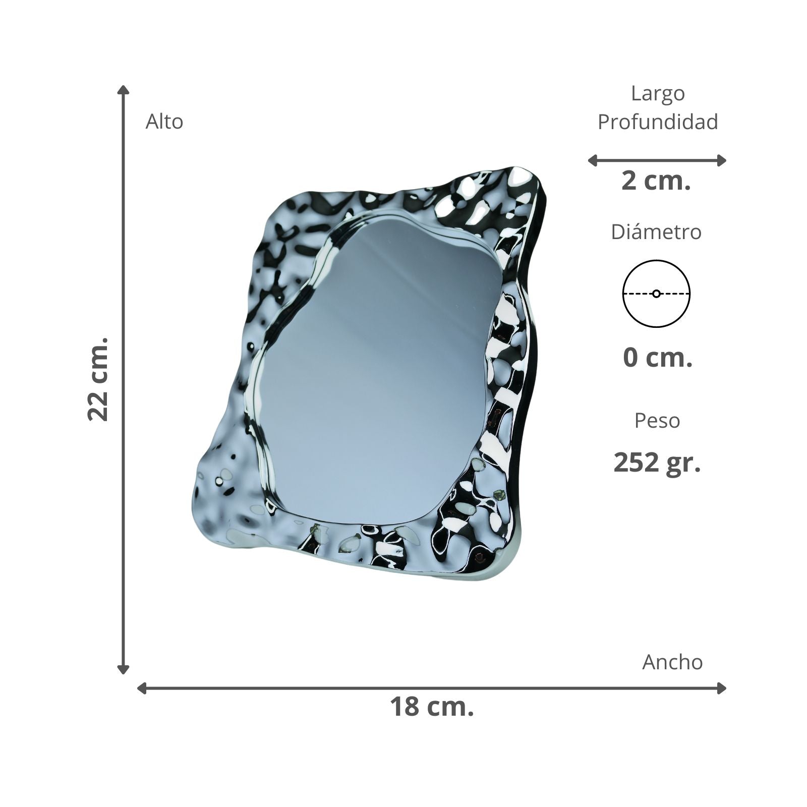 Este magnífico espejo, con un delicado marco de olas en tono plateado, es el complemento ideal para tu mesa de maquillaje o como una hermosa pieza decorativa en tu sala de estar. Su diseño excepcional incluye un soporte para colocarlo de forma segura sobre cualquier superficie, además de un gancho que permite colgarlo fácilmente en cualquier pared.