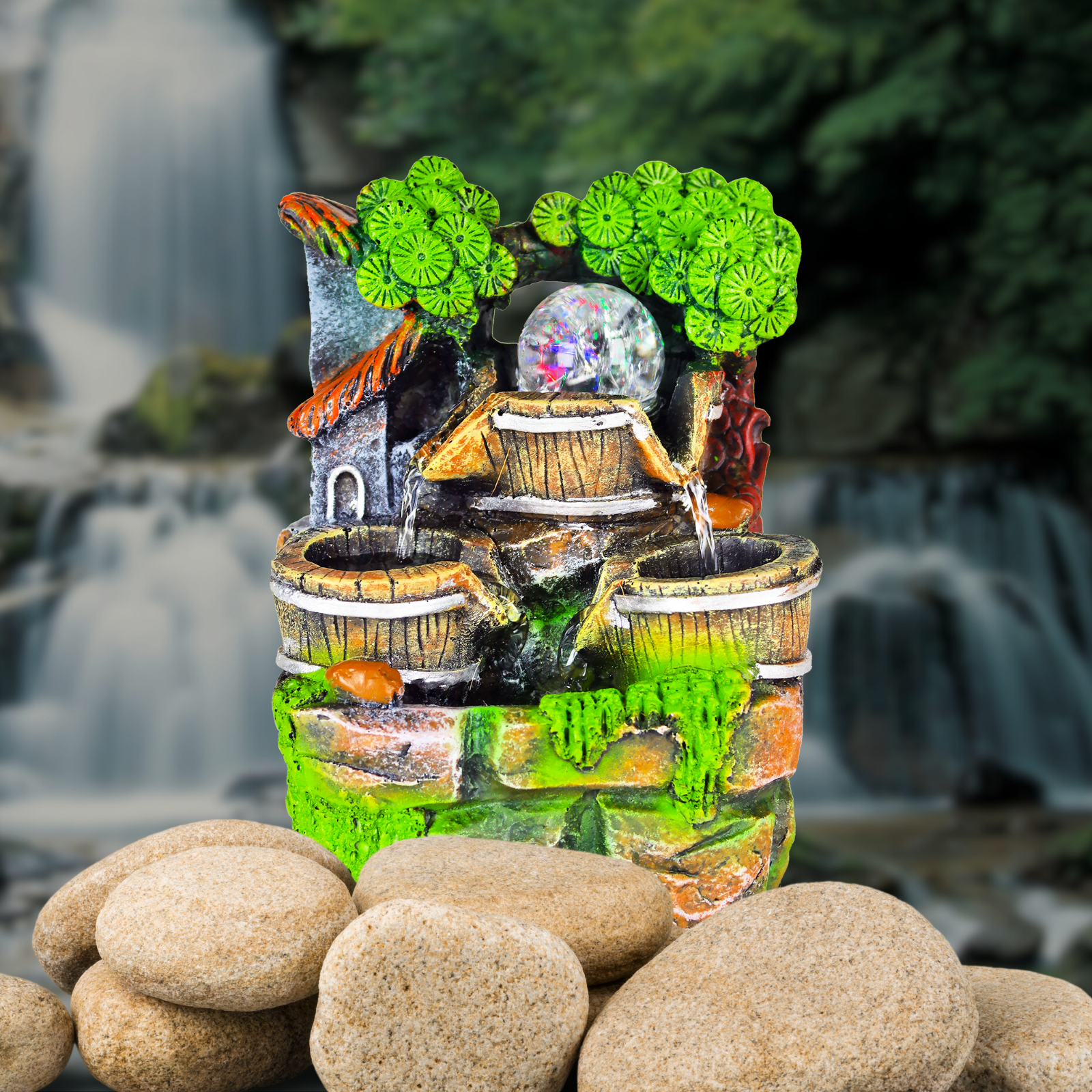 - Diseño cautivador con cascadas de agua y bola de cristal iluminada.