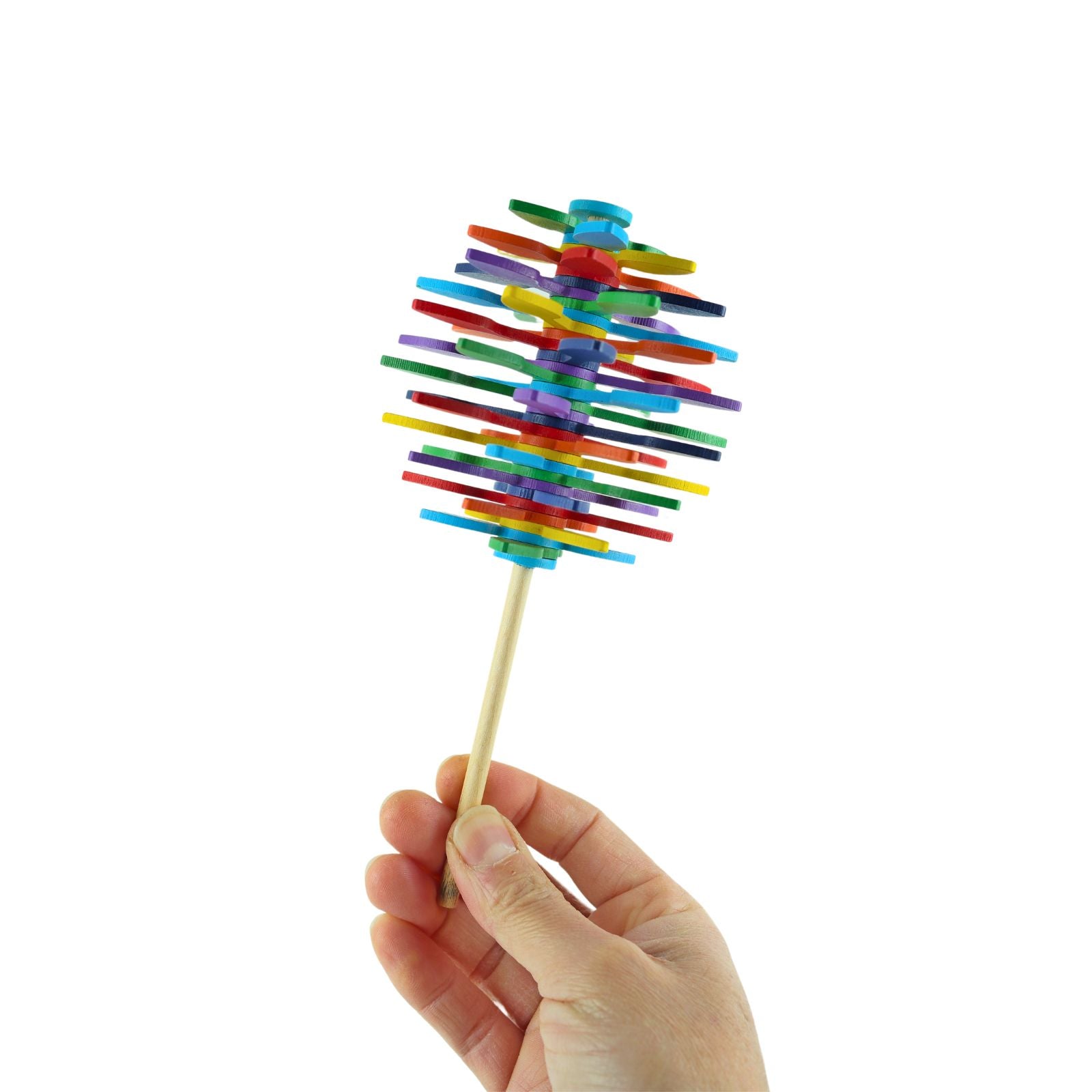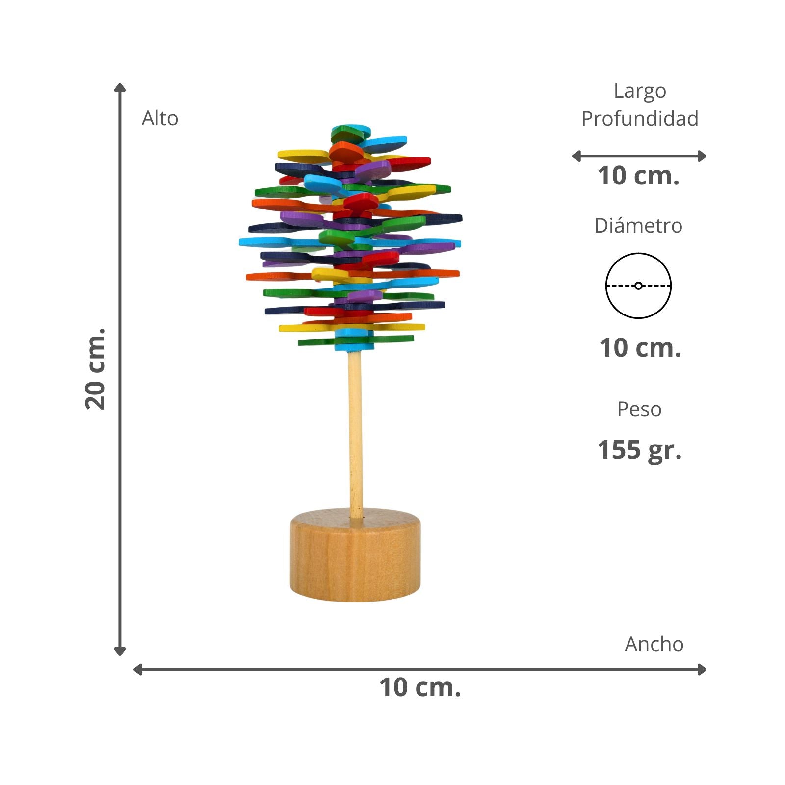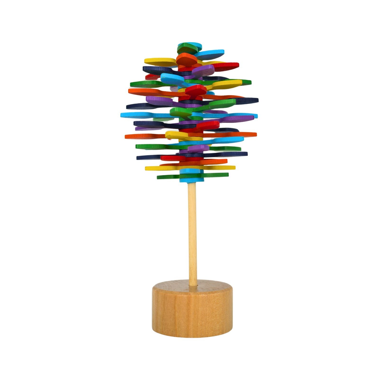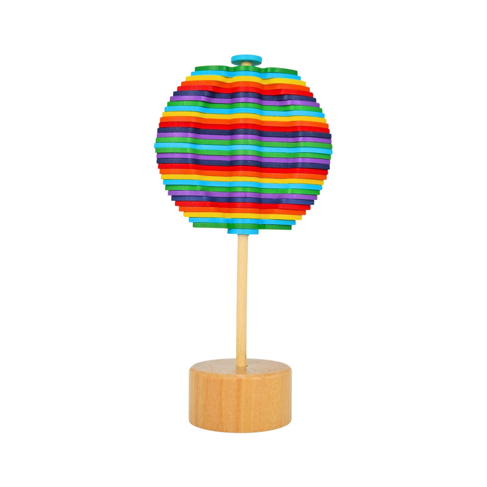 La Piruleta Giratoria de madera es un juguete educativo y entretenido para niños. Con este juguete, los niños pueden pasar horas de diversión girando el bastón de madera en 360 grados. Al hacerlo, las 35 hélices de madera crean una forma interesante y colorida, lo que ayuda a los niños a entender los efectos de la fuerza aplicada en la física y a mejorar la motricidad. Además, es una excelente opción anti estrés, ideal para mantener a los niños relajados y ocupados. Los adultos también pueden beneficiarse, usándolo para aliviar la tensión o la ansiedad, convirtiéndolo en el accesorio perfecto para el escritorio. Es el regalo ideal para niños o seres queridos.