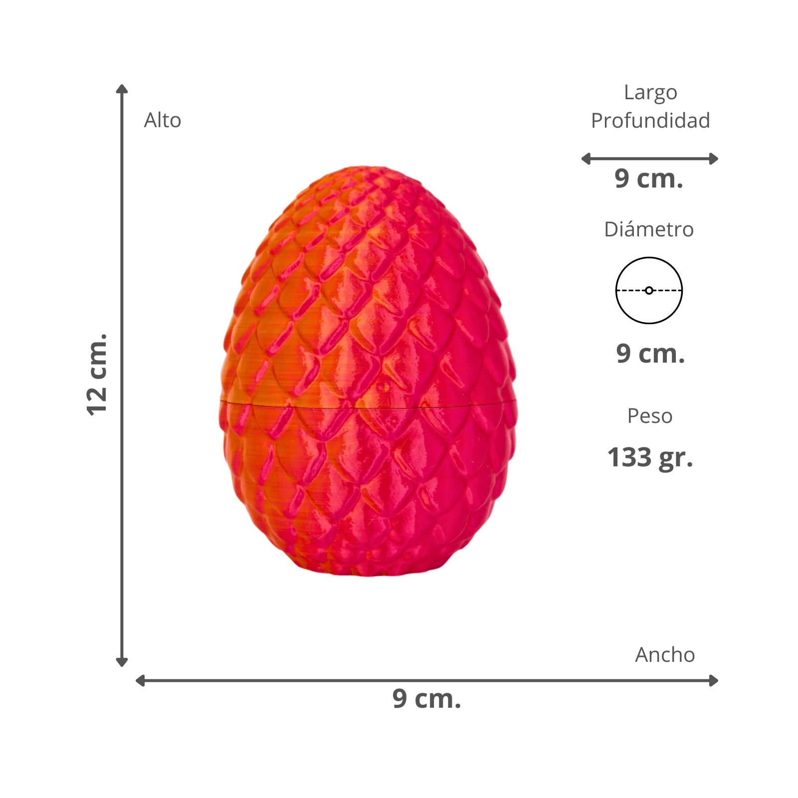 - Dimensiones Huevo: 12 x 9 x 9 cm.