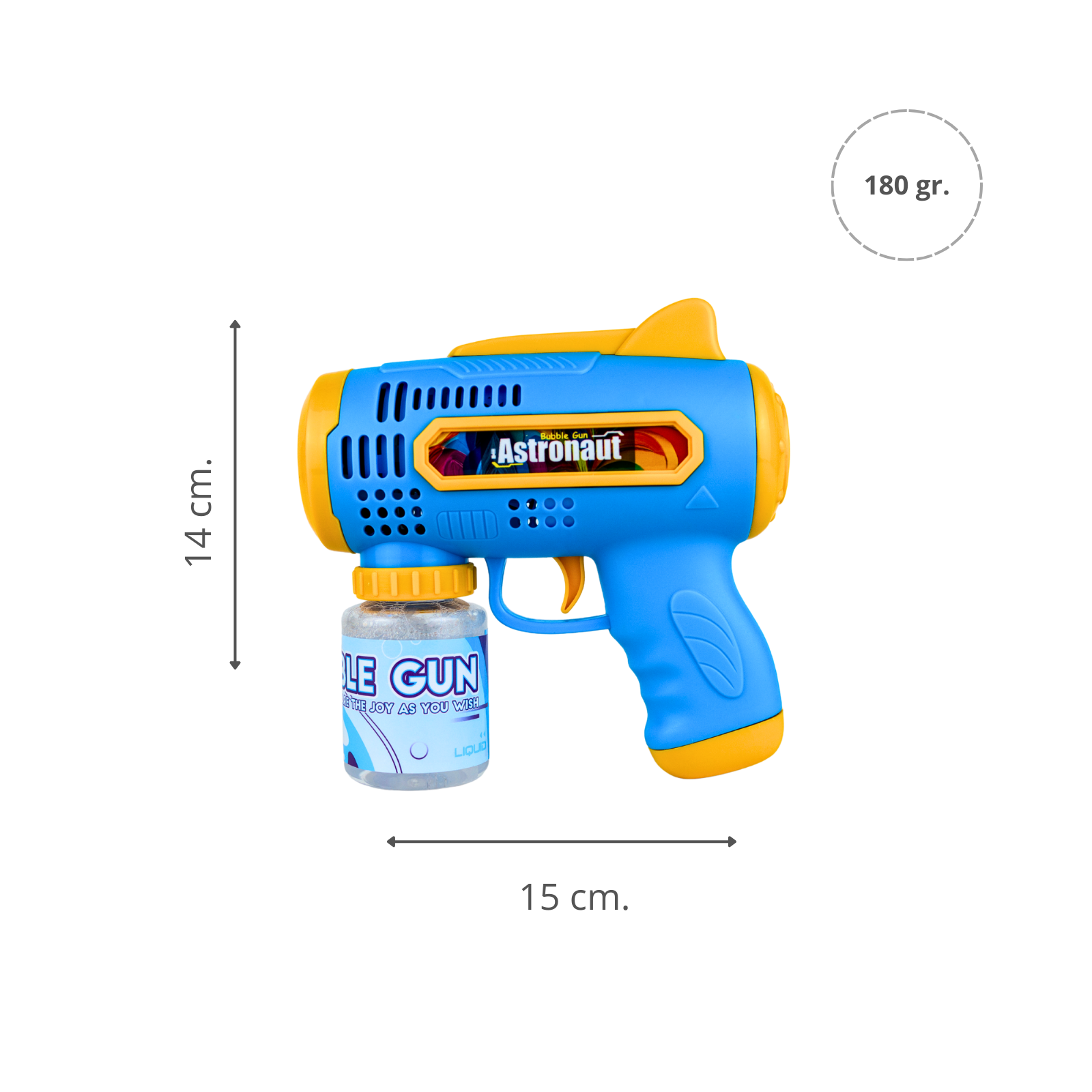 El funcionamiento es muy sencillo: solo debes enroscar la botella de 90 ml al lanzador, presionar el gatillo y dejar que la máquina haga su magia. Funciona con 2 pilas AA (no incluidas).